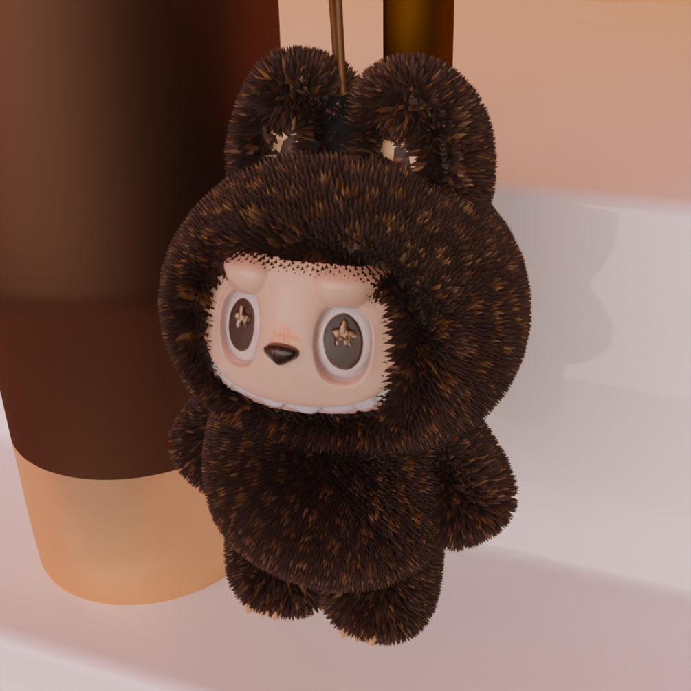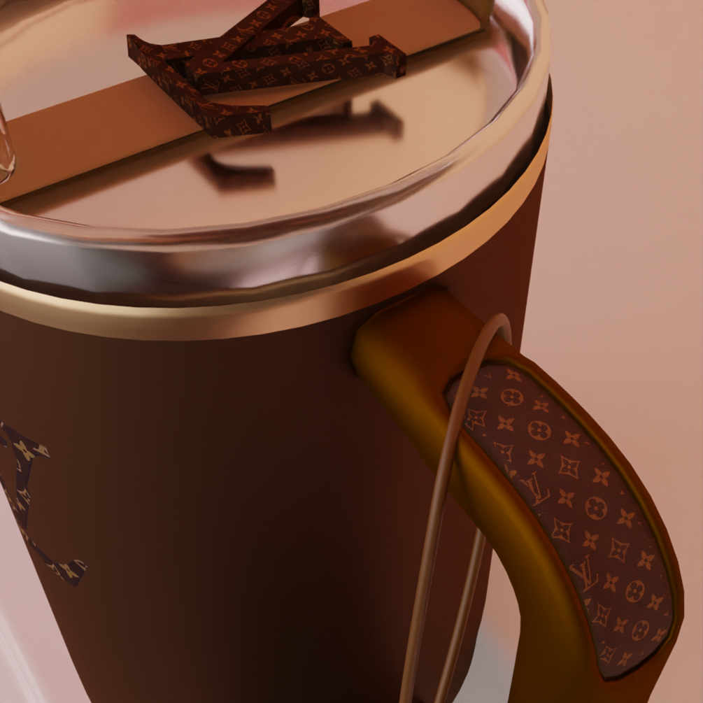 Luxury Louis Vuitton tumbler includes 3D logo on lid tag, LV pattern on handle and detachable Labubu with patterned fur. Sip in style! Blender only!