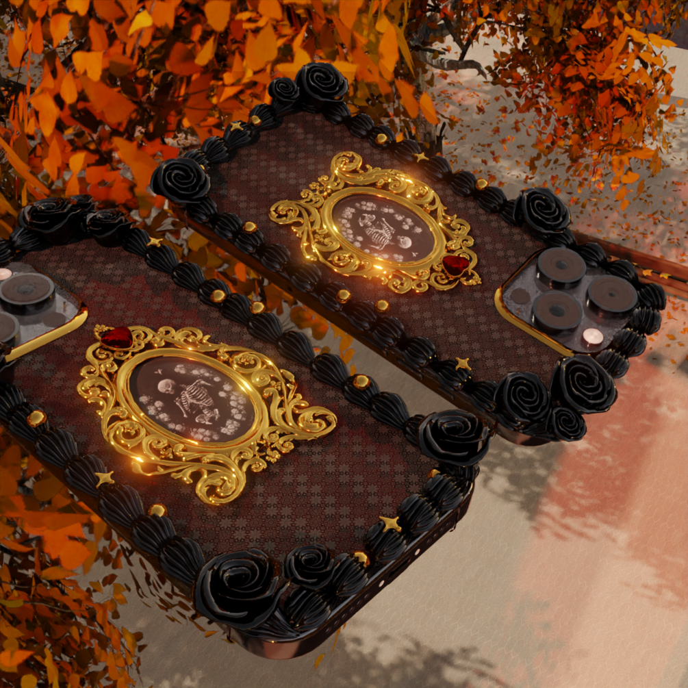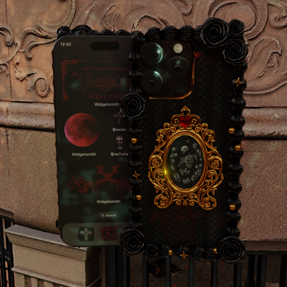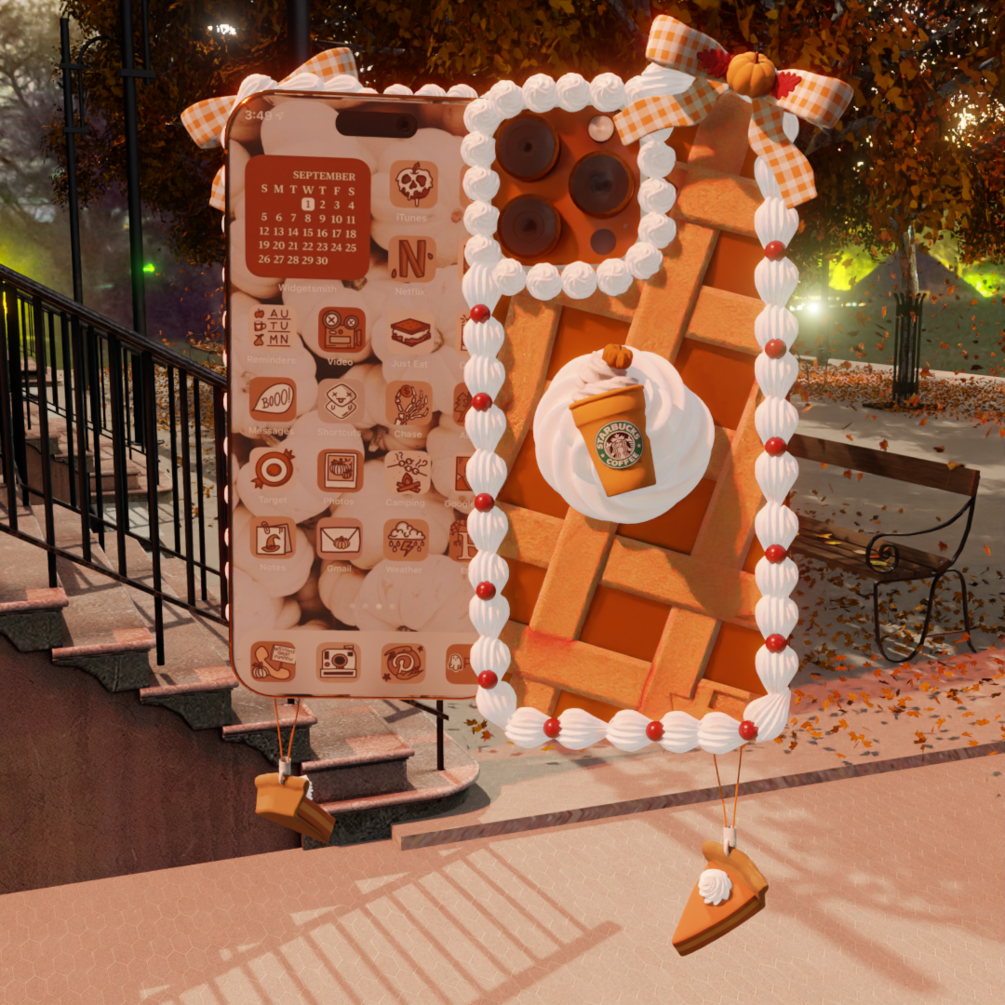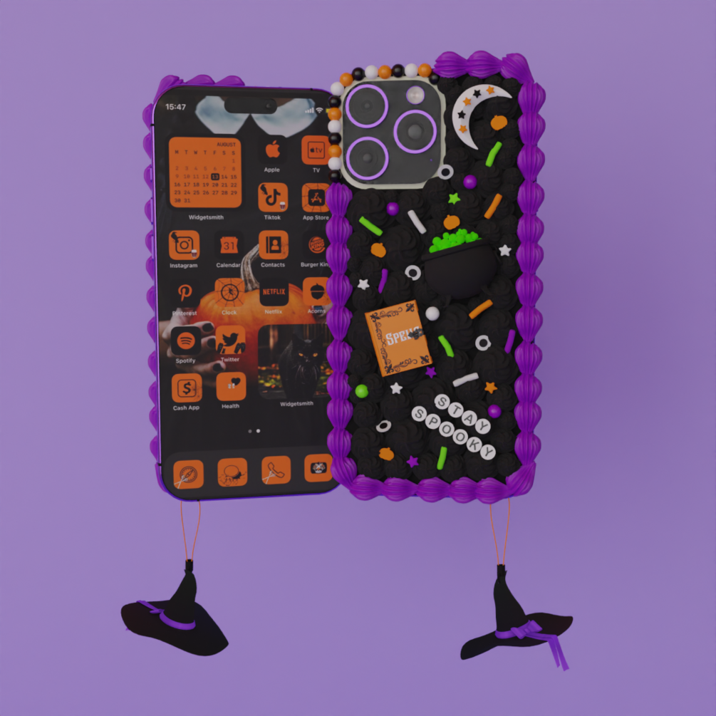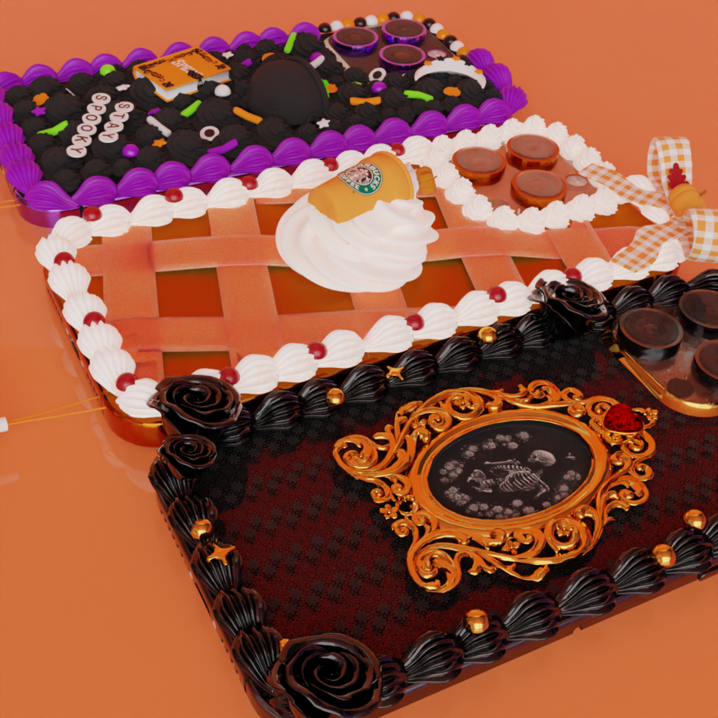 3 wickedly delicious phones with Decoden icing and charm details! Set includes Spooky Witch with Halloween sprinkles and alphabet bead details, Pumpkin Spice Pie with lattice pie crust and gingham bow, and Undying Love vampiric roses with a frame. All phones have corresponding Widget-themed screen. Blender only!
